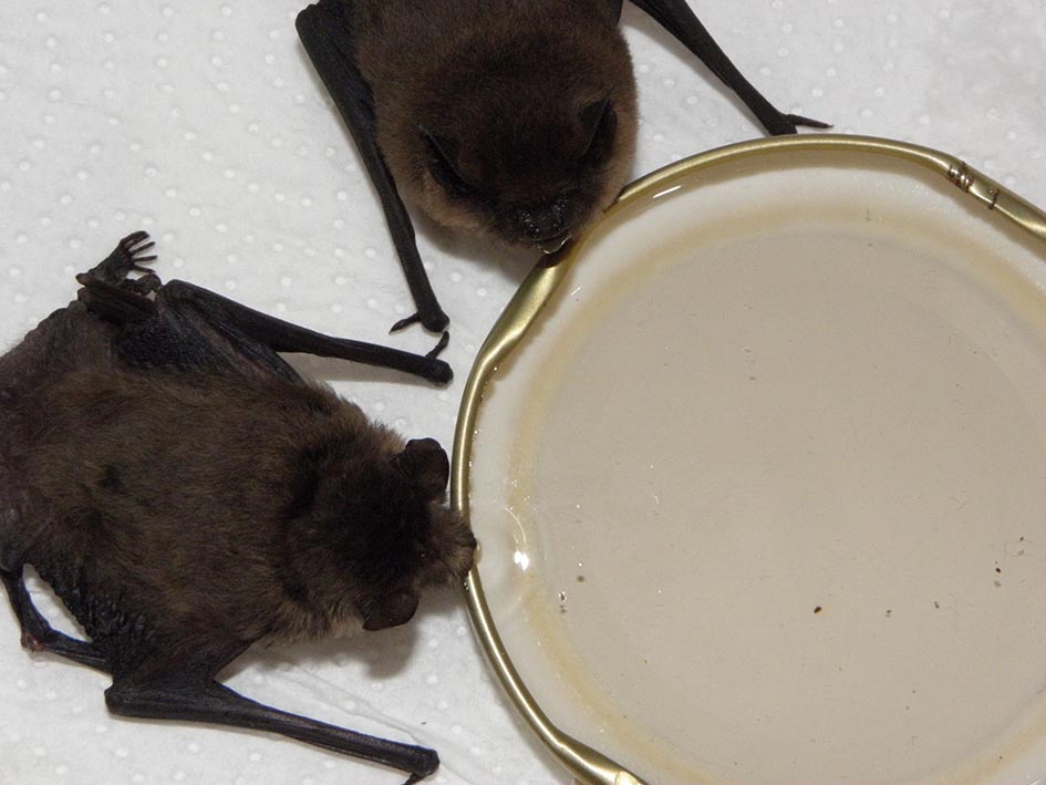 Nun benötigen Sie die Hilfe eines Fledermauspflegers (s. Rufnummern und Adressen oben). Sollten Sie niemanden erreichen oder niemand kann Ihnen noch am gleichen Tag helfen, können Sie den Tier auch eine Ersatznahrung anbieten: Verdünnen Sie (am besten in einem kleinen Glas, einem Eierbecher oder ähnlichem) einige Tropfen Bio-Ziegenmilch aus dem Supermarkzt oder Reformhaus (zur Not Kondensmilch mit einigen Tropfen lauwarmen Fencheltee - wenn kein Fencheltee vorhanden ist nehmen Sie nur warmes Wasser) und halten es dem Tier in einem Löffel vor sein Mäulchen. Mit etwas Glück wird das Tier etwas von der Nahrung aufschlecken. Bei erwachsenen Tieren wiederholen Sie dies ca. drei Mal täglich. Bei Jungtieren schauen Sie bitte unter 6) nach. Versuchen Sie gar nicht erst, Fliegen oder Mücken zu fangen oder getrocknete Mehlwürmer zu kaufen, das klappt nicht. Mehlwürmer können nur lebend verfüttert werden. Wenn Sie sich längere Zeit und das Tier kümmern können und wollen nehmen Sie bitte auf jeden Fall nochmals persönlichen Kontakt zu einem erfahrenen Fledermauspfleger auf (s. Kontaktdaten oben).